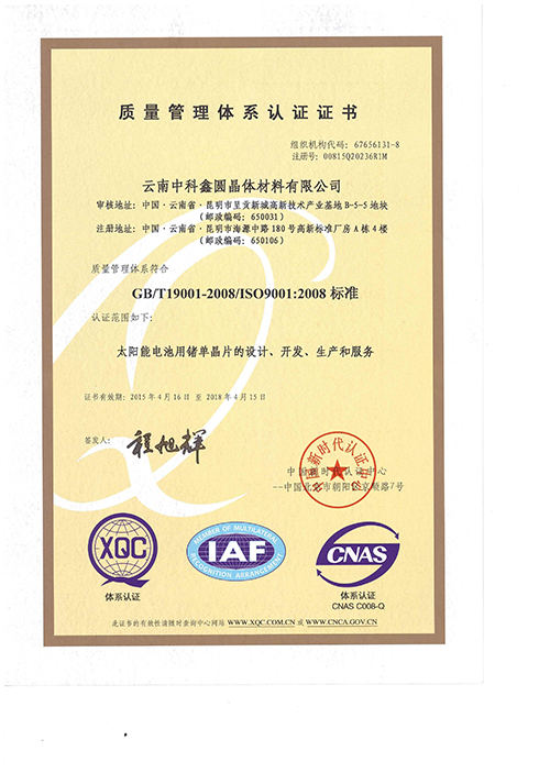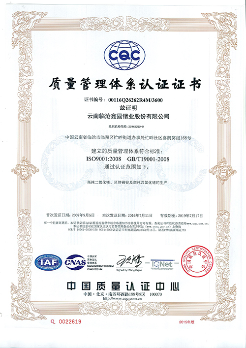 云锗质量管理体系认证书(中文)